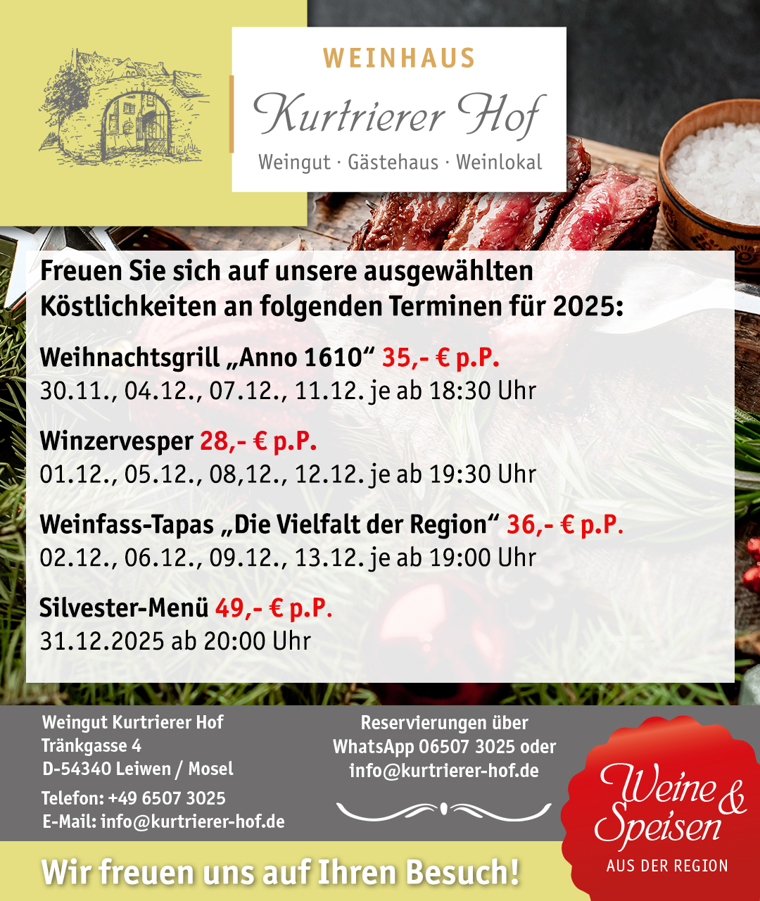 Feiern Sie mit uns die Adventszeit und einen unvergesslichen Silvesterabend! Genießen Sie köstliche Speisen und erlesene Weine, die Ihre Feier zu einem besonderen Erlebnis machen.